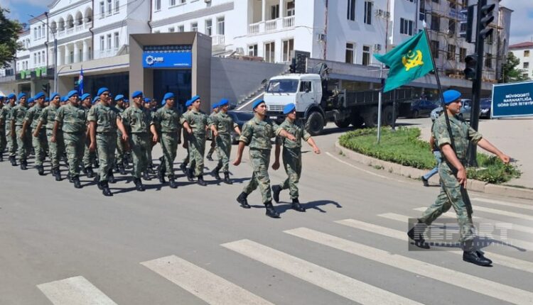 Şəxsi heyət hərbi orkestrin müşayiəti ilə şəhərin mərkəzi küçələrində müəyyən edilən marşrutlar üzrə yürüş edib.