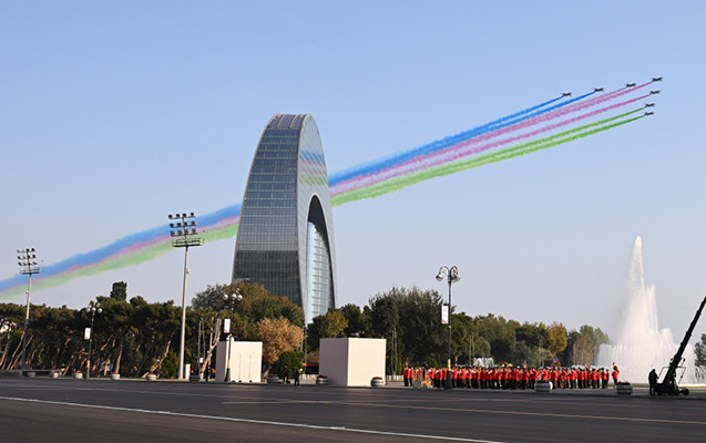 Azərbaycan və Türkiyə pilotlarının iştirakı ilə aviasiya nümayiş uçuşları isə izləyicilər üçün unudulmaz olub. Parad çərçivəsində uçan Mİ-17 döyüş-nəqliyyat helikopterləri Azərbaycan, Türkiyə və Pakistan respublikalarının Dövlət bayraqlarını daşıyıb, Mİ-17 helikopteri Ümummilli Lider Heydər Əliyevin portretini nümayiş etdirib. Həmçinin uzaqmənzilli hava-yer tipli raketlərlə təchiz olunmuş Mİ-17 döyüş-nəqliyyat helikopterləri, MFİ-17 təlim təyyarələri, L-39 təlim təyyarələri, İL-76 hərbi-nəqliyyat və silahlanmaya yeni qəbul edilmiş C-27J yük təyyarələri, silahlanmaya yeni qəbul edilmiş JF-17 (Cİ EF) çoxməqsədli qırıcı təyyarələr, Türkiyə Hərbi Hava Qüvvələrini təmsil edən F-16 çoxməqsədli qırıcı təyyarələr, modernizasiya olunmuş SU-25-Laçın hücum təyyarələri iftixar dolu hisslər yaşadıb. SU-25 hücum təyyarələri isə Azərbaycan Bayrağının rənglərini paytaxt səmasında canlandırıb.